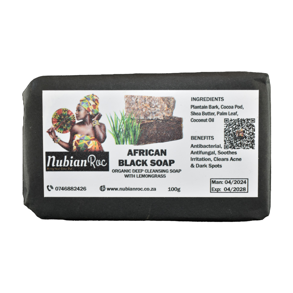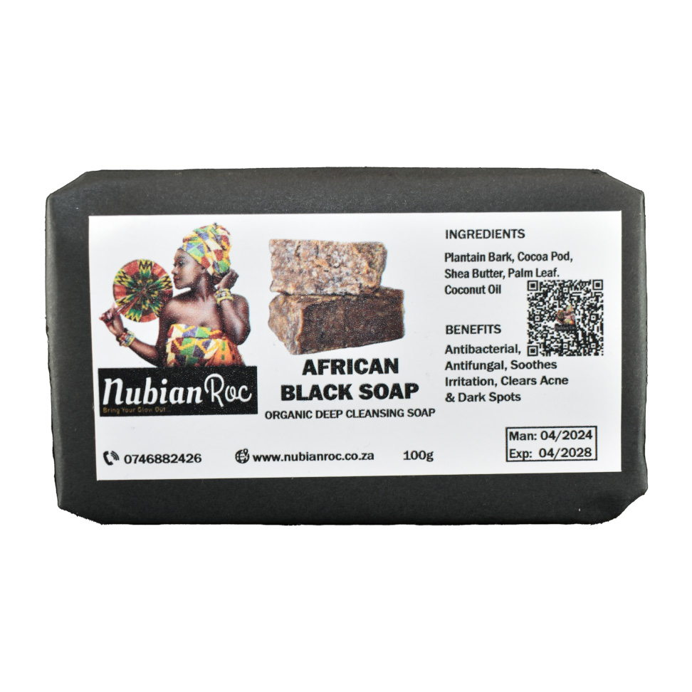 African Black Soap (100g) – A natural detoxifying cleanser for face, body, and scalp.