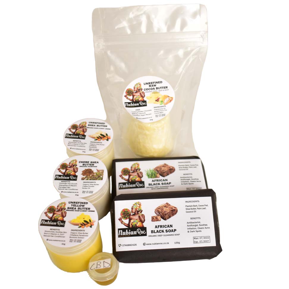 The Nubian Roc All-in-One Hamper is a thoughtfully curated collection of our best-loved natural products, crafted for both skin and hair care rituals. Featuring african black soap for gentle cleansing, unrefined shea butters for deep hydration, our signature chebe hairfood for growth and strength, and cold-pressed hemp seed oil for targeted nourishment, this hamper delivers a complete care experience from head to toe.